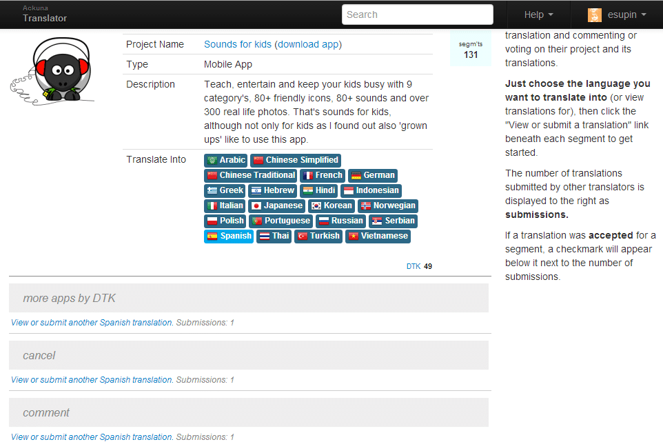 Developers can upload their app for free and specify certain words or phrases that need to be translated these are called segm’ts on Ackuna. Users can browse segm’ts and translate as many or as little of them as they want. Other users can up-vote or down-vote translations based on the accuracy of the translation so developers will know whether or not a segm’t has been poorly translated. Under Ackuna’s platform, translators don’t need to know how to code, and coders don’t need to know how to translate.