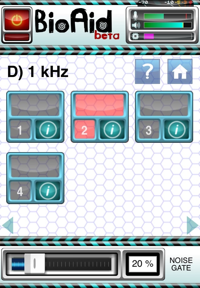 My first impression was that I was surprised by how easy it was to adjust the settings for the BioAid. You can adjust the settings to match your hearing loss from moderate to severe in various areas such as flat hearing loss (meaning your hearing loss is about the same on all frequencies), severe high frequency hearing loss, and more. My hearing loss is greater than 90db, and my ability to hear high frequencies is virtually nonexistent (legally I am deaf). The majority of hearing aids available on the market are not powerful enough for my hearing loss, so I had very low expectations for these settings and features. However, I ended up being pleasantly surprised. With the BioAid set on the D) 1kHZ setting with no noise gate, I could hear!