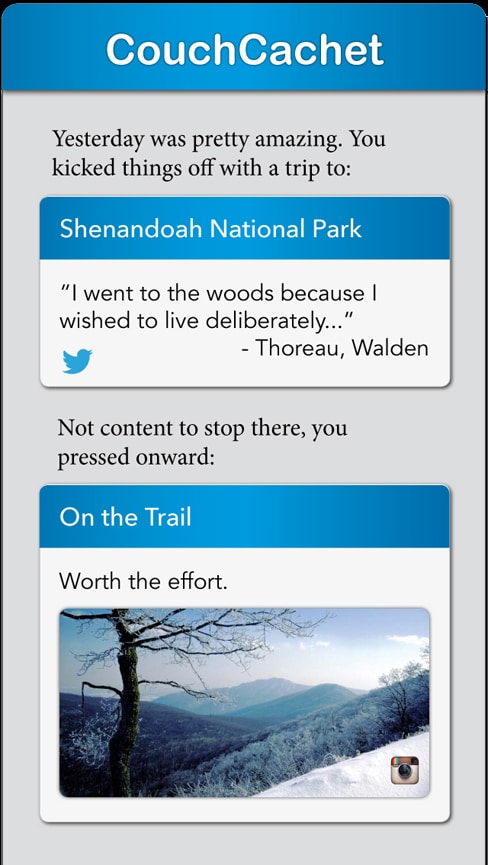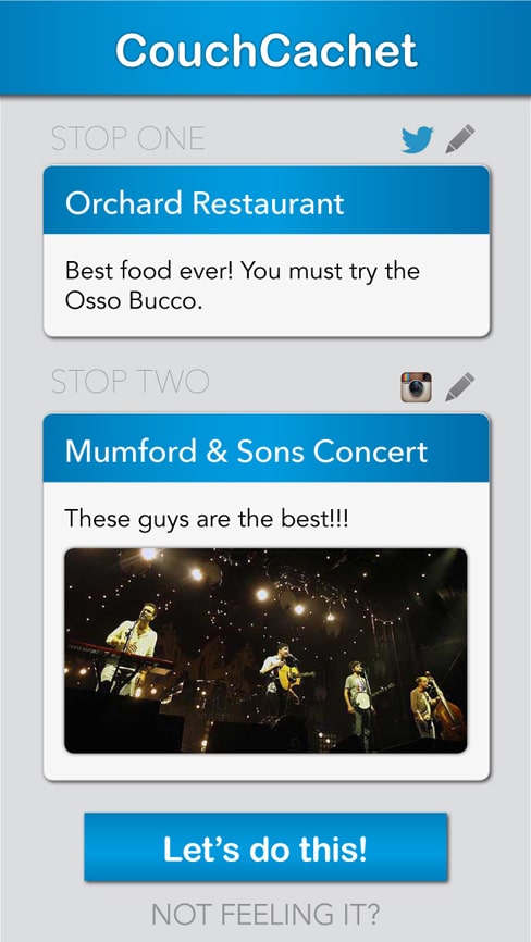 CouchCachet was originally created as a joke, but apparently it fills a need that some people have. Nobody wants to be the one sending a tweet on Saturday night that says “I’m just hanging out at home watching a movie and eating a pizza” when everyone else is checking in and tweeting pictures from all the cool places in town. This app fixes that. By creating a fake exciting life, now you too can be part of the “in crowd” in social media.