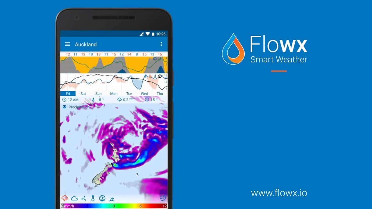 The app itself features a map with eight different layers of information that can be accessed. These are rainfall, satellite imaging, temperature, wind speed, pressure, wave condition, wind circulation, and wave circulation. At the top of the screen, you can find a graph containing upcoming weather trends that can be tracked by the hour for up to six days. You can download Flowx on the Google Play Store.