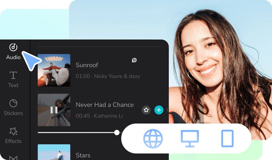 • Add trillions of music clips and sound effects to videos.