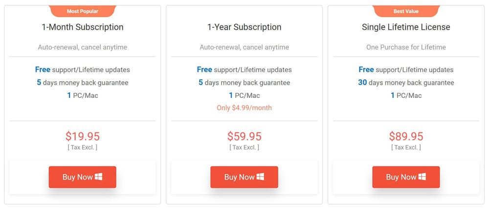 - 1-Month Plan: For $19.95, you get 1-month access to all features, 1-month free updates, and a 5-day money-back guarantee. It provides a single PC/Mac license with auto-renewal that can be canceled at any time.