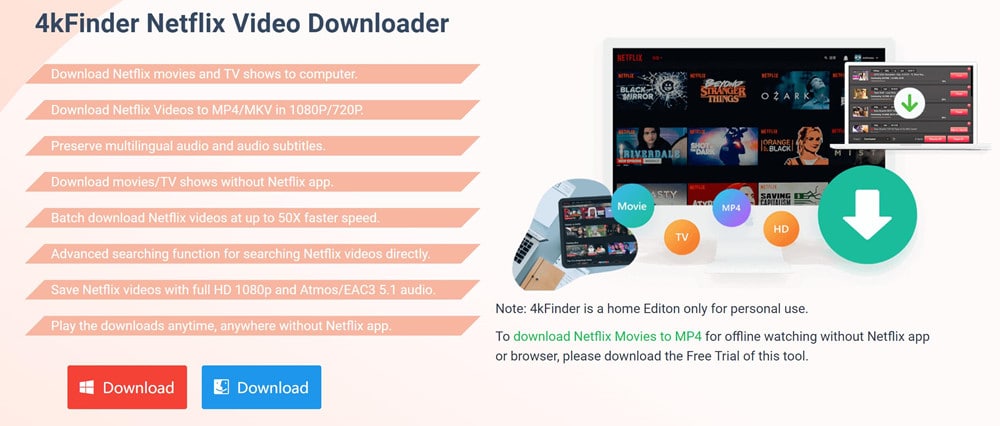 4kFinder Netflix Video Downloader makes downloading Netflix movies or TV shows in HD (up to 1080p) quality and save them in MP4 or MKV for seamless streaming on various devices. So that you can enjoy Netflix content offline on smart TVs, tablets, computers, media players, and mobile phones.