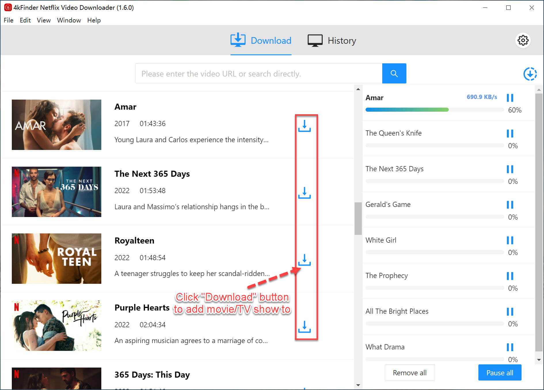 4kFinder now lets you easily download entire TV show seasons in one click with its advanced batch download feature. If your network connection is stable, the download speed is 10x faster and you can download Netflix videos within minutes. Additionally, you can add new tasks to the download queue while it’s ongoing.