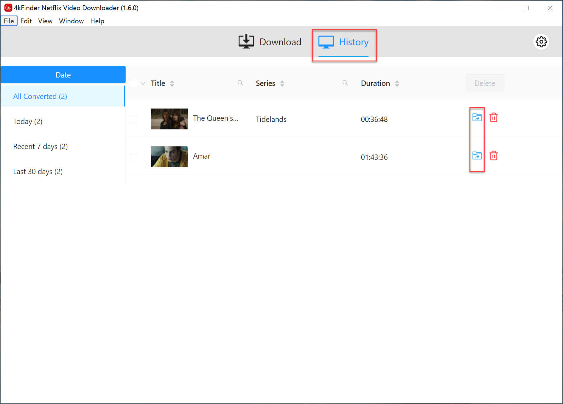 After download, navigate to the downloaded Netflix movies directly by clicking on “History” and then selecting the “Blue Folder” icon.