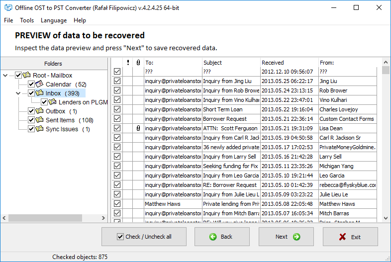 Also, the program has rigorously tested the tool for converting very large-sized OST files. The tool converts the large OST file in situations when Microsoft Outlook or Exchange Server has crashed or is facing a disaster, or Outlook is having synchronization issues. It converts the OST file efficiently and extracts the data with 100% precision.