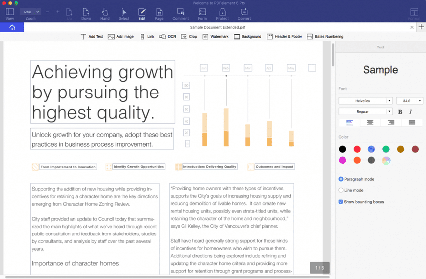 PDFElement 6 Pro comes with a clean and intuitive user interface that makes editing PDF files an extremely simple task. With the various features provided by this tool, you can edit, create, and convert PDF files with unbelievable ease. The most outstanding feature is the select and edit option for text, which basically means that you can select any text and change its font, size, or position, just like in an MS Word doc.