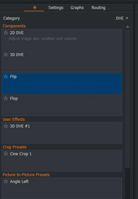2. Open the sequence in the timeline and go to the VFX tab and click +. Now, look for and click the Flip button below 3D DVE.