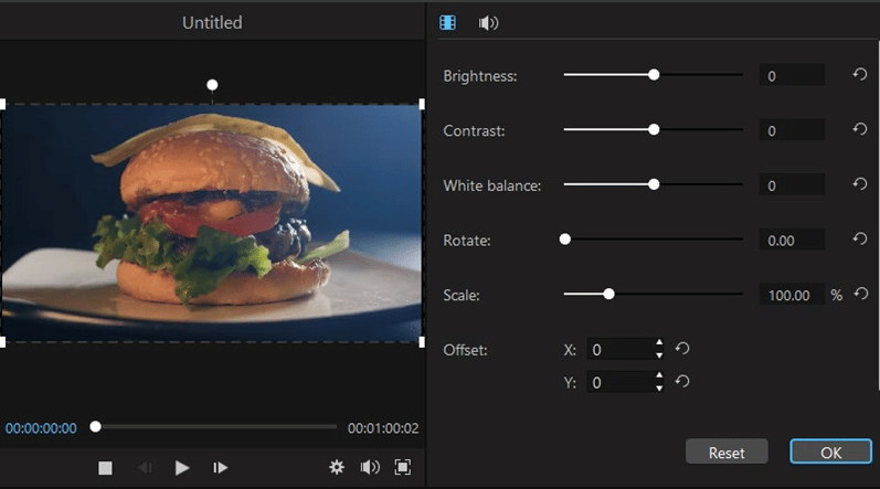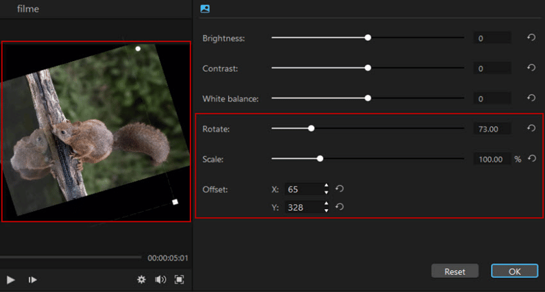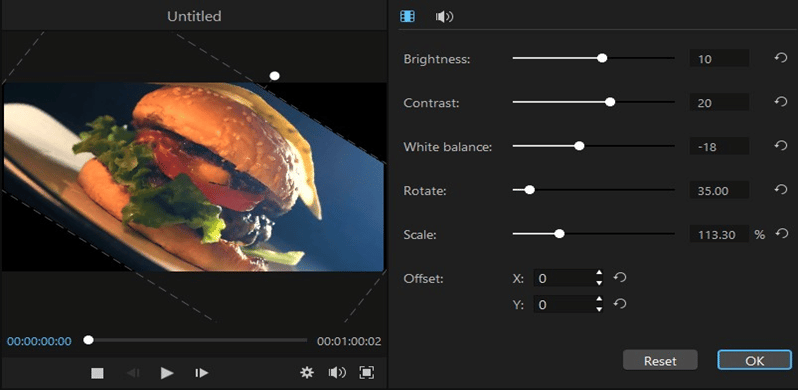 Once you do that, right-click and select edit or just double-click the image in the timeline. The edit options will appear on the top right panel, where you can use the Rotate slider or Offset options. Click OK when you’re done and then export the video in a range of lossless formats as shown in Step 4 of the process above.
