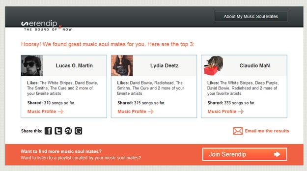 It’s like being able to get your friends to fill up your playlists. Serendip was built on social music sharing, and the songs that originate from publicly available sources such as YouTube, Bandcamp, Vimeo, and SoundCloud – so there is never any worry about pirating. What it essentially does is plug into your social network and create a radio station based on the music your friends (and their friends) like. It gets even better because they created MyMusicSoulMates so you can meet new people based on your shared love of Bob Marley or Justin Bieber.
