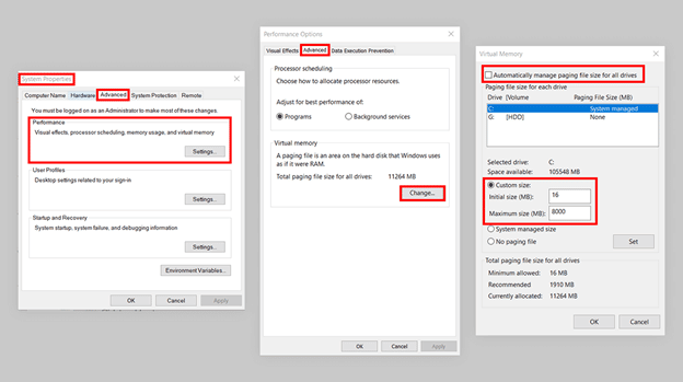 You can start by choosing an appropriate paging file size. You’re going to need administrator rights to access this setting. Illustrator works best when the maximum paging file size is about three times larger than the amount of RAM.
