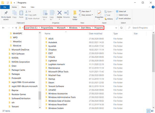 Step 3. Turn off startup applications for the current user by transferring all icons and shortcuts from the Startup folder (OSDisk\ProgramData\Microsoft\Windows\Start Menu\Programs\StartUp) to another destination.