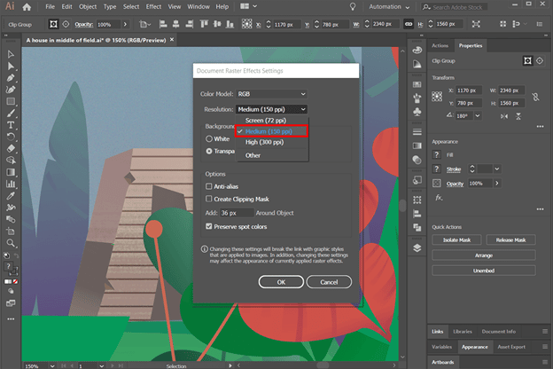 - Pick Screen if you’re editing files. Illustrator will use a 72ppi resolution for raster effects, boosting the display speed.