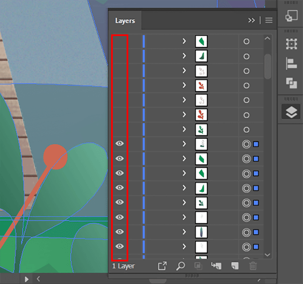 To hide a layer, click the eye icon next to the layer name. To hide all layers other than the selected one, click the eye icon while pressing down Alt on Windows or Option on Mac OS.