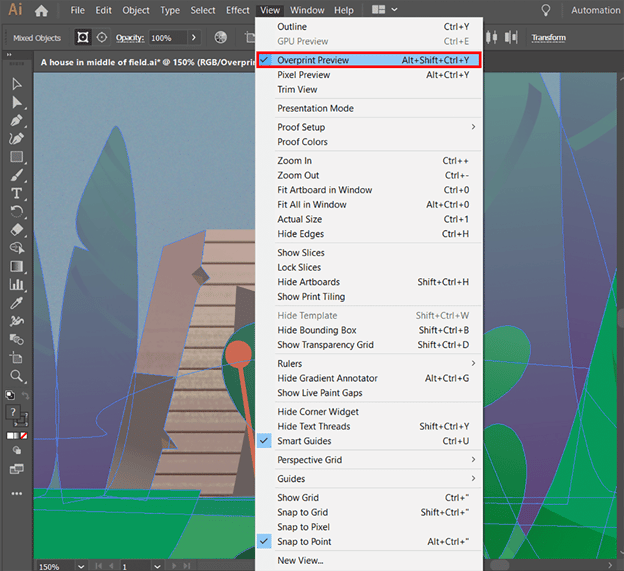 To turn this mode on or off, select View>Overprint Preview, or use the Alt+Shift+Ctrl+Y hotkey combination.