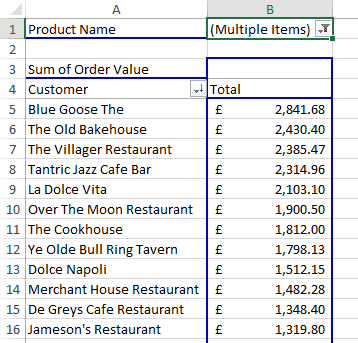 Once you have your Pivot set up, we can then easily filter or sort that data as required, as it automatically turns on these options when you create the Pivot. So this is great for showing items such as the highest sales figures per Customer, largest to smallest, or filtering any products you want to home in on.