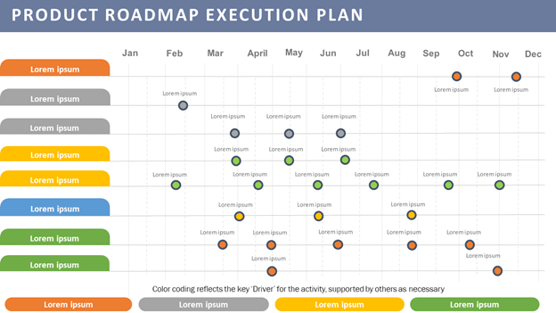The above is a great product roadmap template that utilizes different colors to denote important activities and key drivers. This template will help you demonstrate your product execution strategy and milestones accurately and succinctly while helping you organize key planned activities and corresponding timelines.