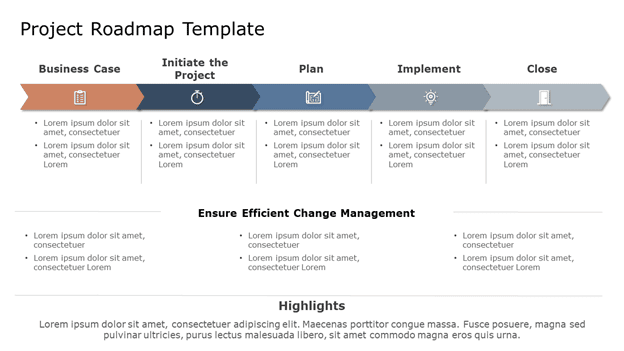 This project roadmap template can be highly effective at providing your audience with a high-level and bird’s eye view of the whole project without going into unnecessary details. The template covers all the major aspects of the project i,e., business case, initiation, plan, implementation, and closing. You can describe each element by giving it a brief but informative description in the provided text-box.