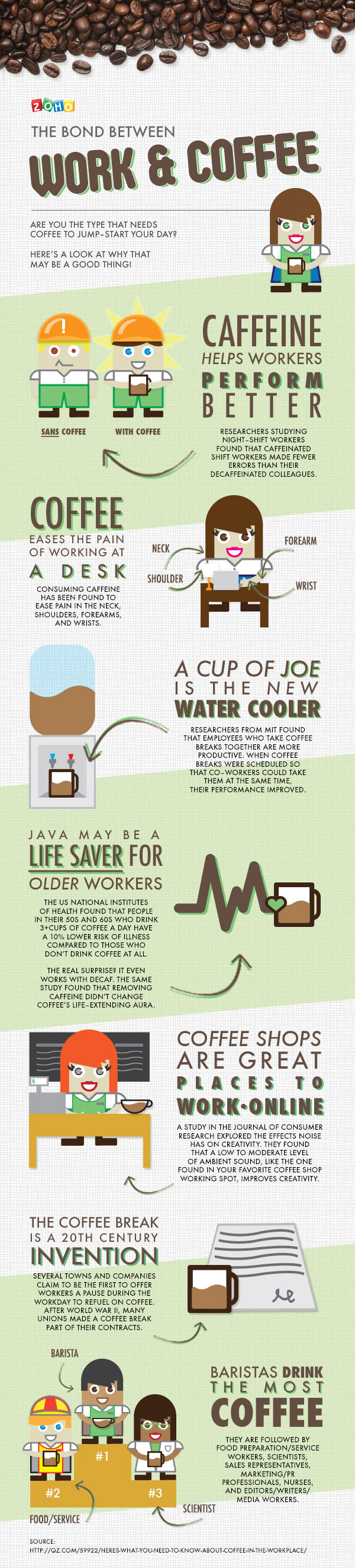 This infographic called the Bond Between Work And Coffee (by Zoho Blogs) caught my attention because it points out even more benefits that I wasn’t aware of, and they specifically focus on your work environment. It’s obvious that coffee gives us a little ‘pick me up’ when we start the workday, but I had no idea that it could help ease the pain of working at a desk and lower the risk of illness in older workers. So the next time you feel guilty about having that second cup of coffee in the morning, just remember this article. There may be more benefits to drinking coffee than you realize.
