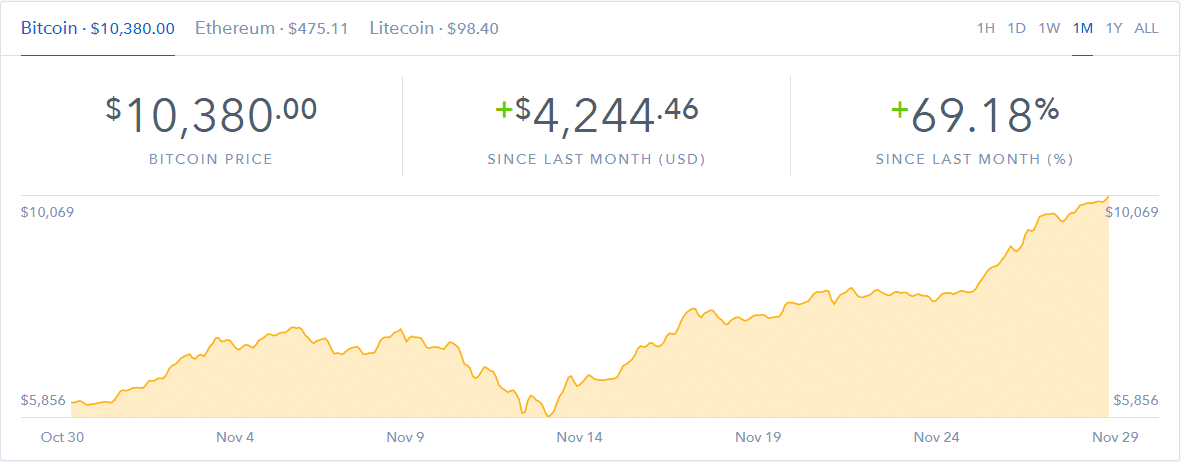Bitcoin just hit the magical new all-time-high $10,000 per bitcoin. It’s a monumental leap for digital currencies and it’s a strong sign that the future belongs to digital money. Bitcoin didn’t just hit $10,000, it soared past it and is now valued at over $10,300 per Bitcoin.