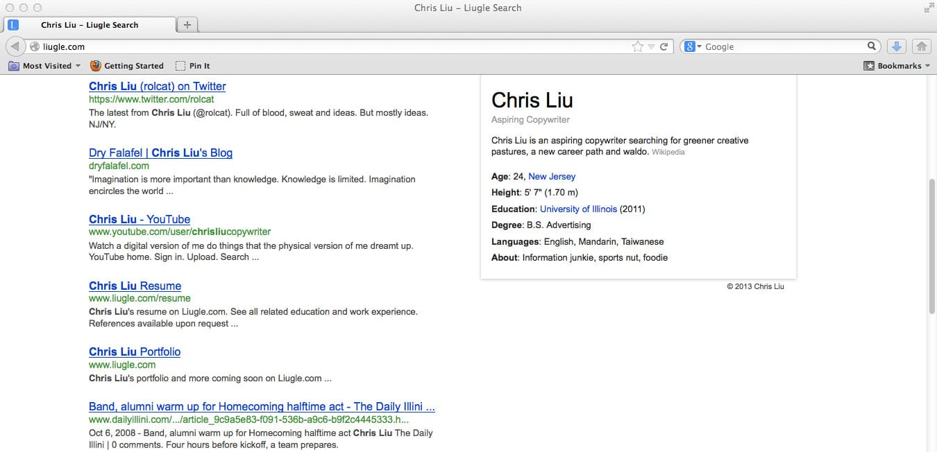 This creative resume was designed by advertising executive Chris Liu. He hopes to find a job as a copywriter, and I’m sure he’ll get a lot of attention from what he’s been able to put together. Of course his fake Google search results page is hyperlinked with each relevant, individual page. With just a few clicks, a potential employer can view his blog, website, portfolio, work history, experience and all his social media accounts.