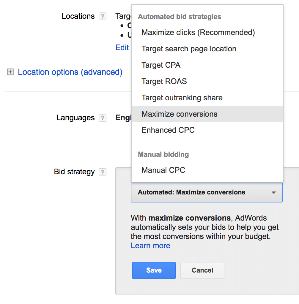 Setting up an automated bid strategy that drives more conversions is relatively straightforward. Simply go to your campaign’s setting page. Then scroll down to where it says “bid strategy” and click the edit link. From the dropdown menu, select Maximize Conversions: