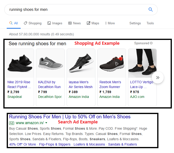 If you are running an e-commerce store, just set up your account in Google Ads & Merchant center, and you are good to go. Here is one example of a shopping ad. For such shopping ads, you need to prepare one Google Shopping feed and upload it on the merchant center account and create a shopping campaign in Google Ads.
