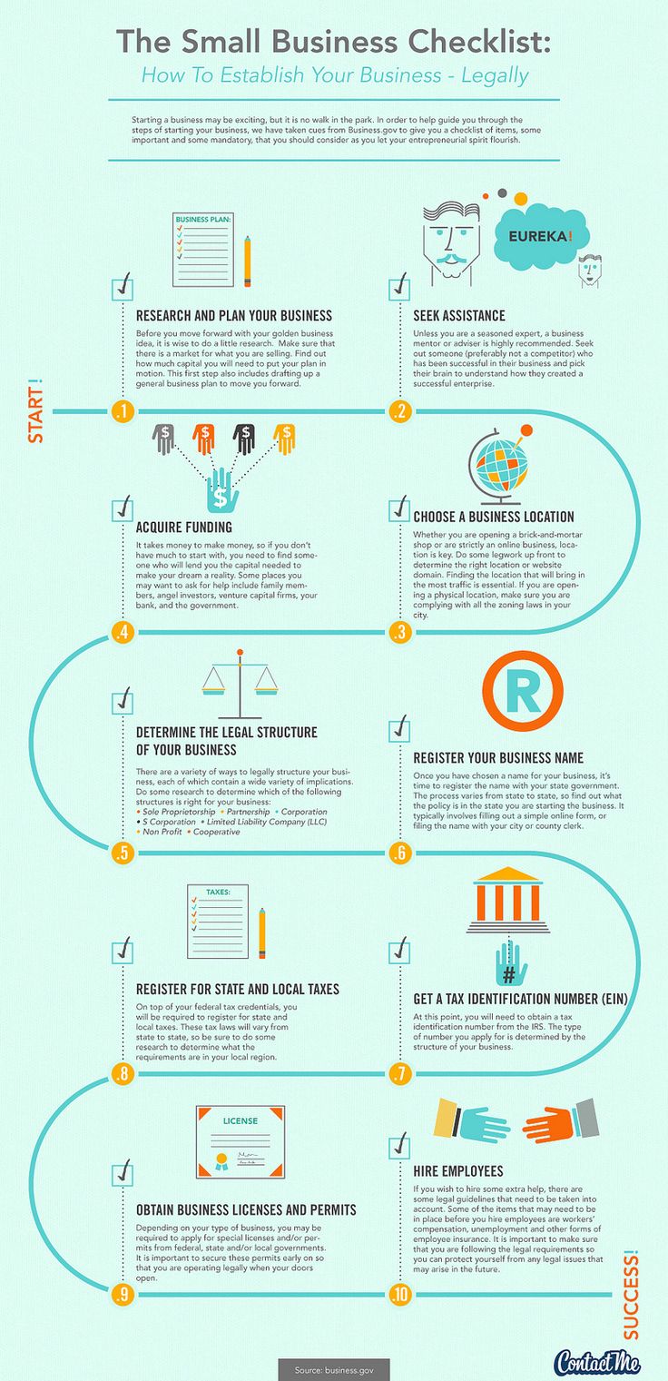 Nevertheless, there are obstacles you need to pay more attention to than the noise generated by public opinion about the legitimacy of your startup. Correctly registering and filing all documents is vital in order for you to feel completely secure once you start pulling the strings that will take you to success. In order to bring some light to the process, if you’re thinking about starting a small business in the U.S., I have been presented an infographic called The Small Business Checklist: How To Establish Your Business – Legally by ContactMe.