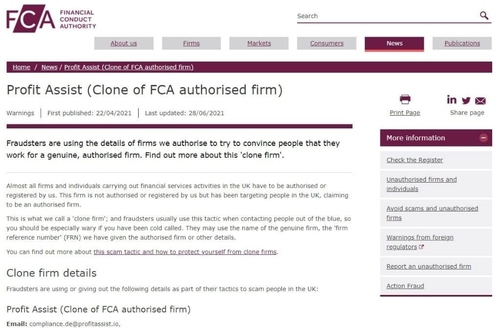 The same warnings related to ProfitAssist came from the UK FCA, Spanish CNMV, and Italian CONSOB.