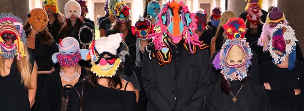 In these pictures, you’ll see the creations of designer Aldo Lanzini. In this interview on Vogue Italia, he says that they are “the condition of contemporary man, some kind of conscious schizophrenia.” The bright colors, strange shapes and very unusualness in these masks make me feel uncomfortable and uneasy. It’s almost like something you’d see at a masquerade ball. I just want to rip them off these heads to see the faces.