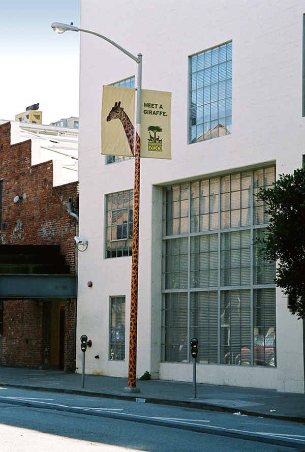 The other kind is the cool kind of stickers that we many times don’t fully appreciate until we’re adults. Examples of this kind include these Star Wars Family Car Stickers and this Sticker Art created with thousands of colored dot stickers. Yesterday when I was checking out some different ads for zoos online, I found this “Meet A Giraffe” sticker ad (below) placed on a streetlight, which advertised the San Francisco Zoo.