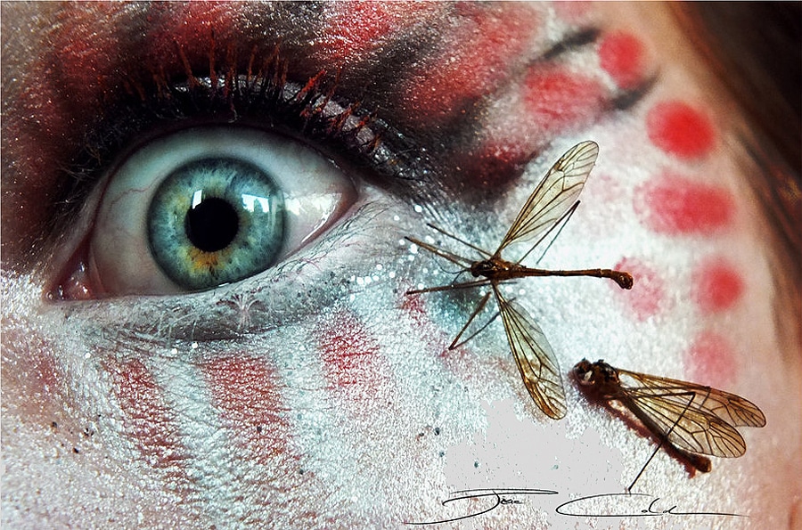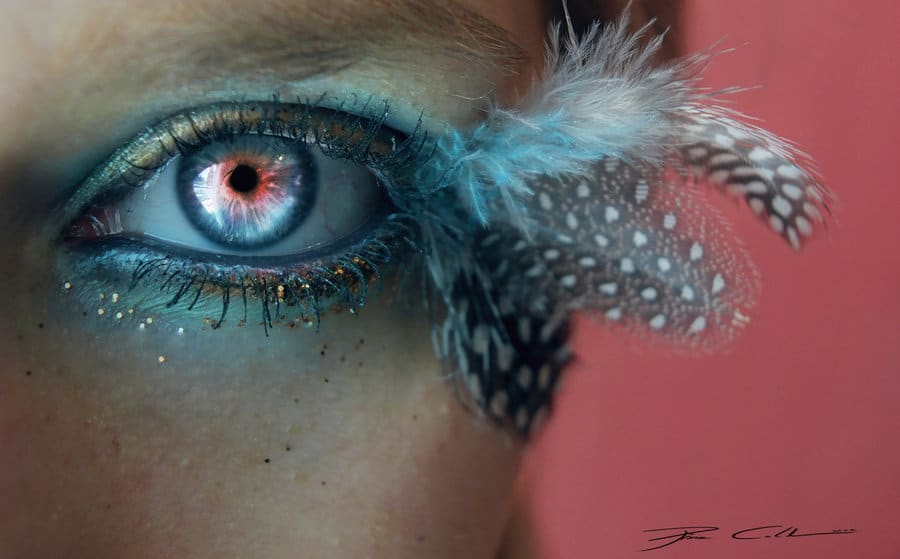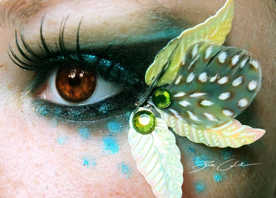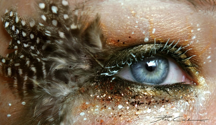 Aside from the brilliant colors, one thing about this which makes it stand out so much is her use of props to give her eye art an extra kick. As you can see, she uses feathers, shiny jewels, tiny insects, fruit, colored contacts and even gold to complete the looks. The red and white mascara is also fabulous, and I wonder if that is paint. Her attention to detail is astounding, and you can see examples of that all over this eye art. It’s amazing that she could even put two different colors on the same eyelash and make both of them stand out boldly like this. I could go on and on complementing her artwork. I can’t stop staring at these, and I hope they inspire you as much as they have me.