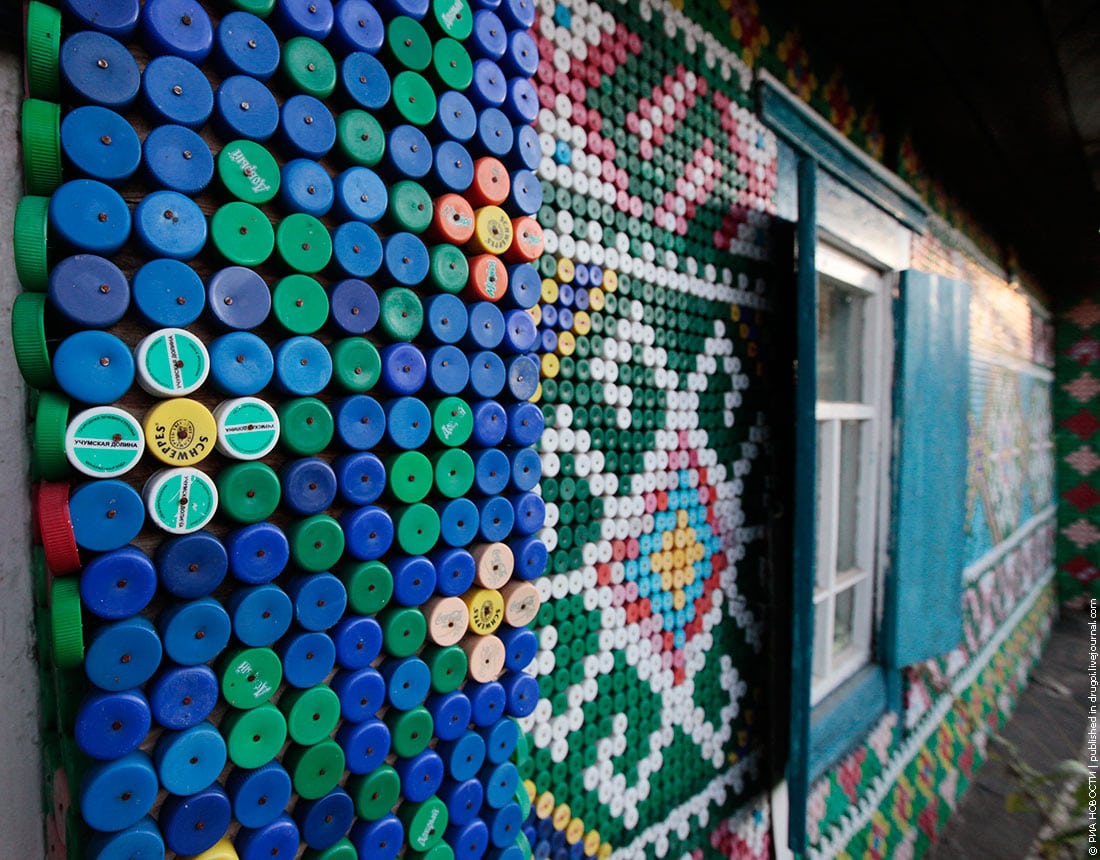 Olga, who you can see below, not only decorates her home with these bottle tops, but she creates pixelated patterns with the colors which make beautiful motifs. She places each bottle top by hand and then attaches it with a hammer and nails. This is so neat! She is nowhere close to being finished either. She plans to keep going until her entire house and the structure next to her house is completely covered with bottle tops. I wonder where she gets all the bottle tops. Surely she doesn’t have to collect them all herself. If she does, Olga, I hope you’re thirsty because that’s a lot of soda, water and juice!