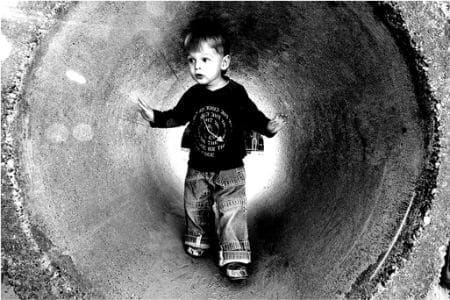 Well, this was an afternoon in the park and these massive concrete tubes were there, so MAX started playing inside of them and as you can see on the expression on his face, he was a little scared. Also, I had my Nikkon SLR with me with a 14mm wide angle on it. I call this one Tunnel of Time.