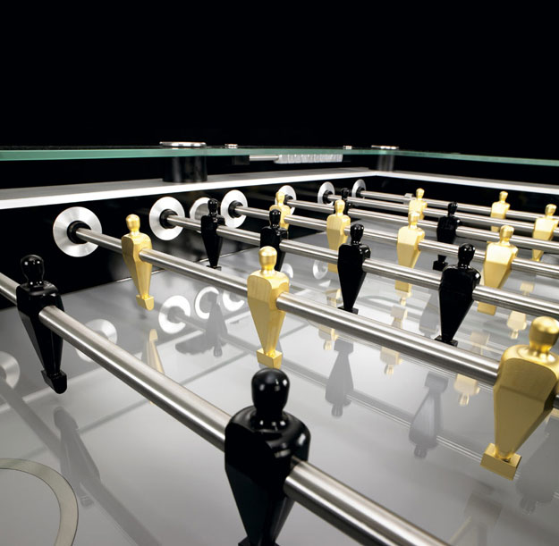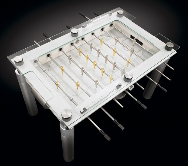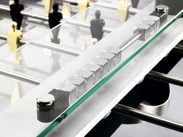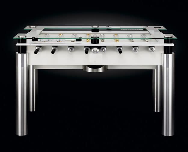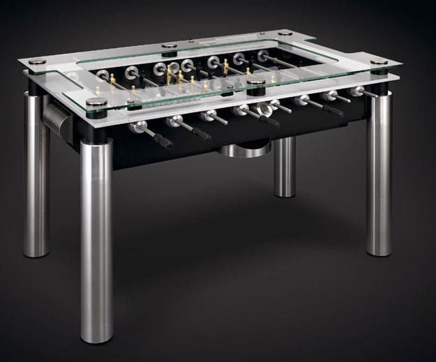 This Lego Star Wars Foosball Table is incredible to me. Today I have another one to share with you. This sleek, shiny beautiful design was created by “Pool Table Portfolio.” Called the Lux Minimalist Foosball table, it is made from stainless steel, aluminum and ESG unbreakable glass.