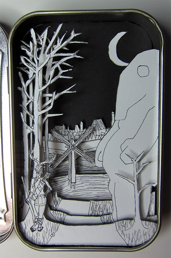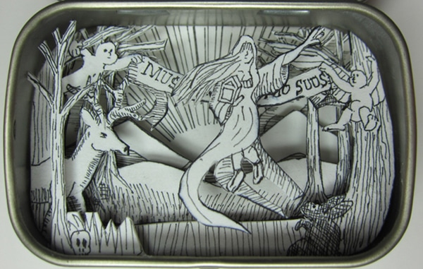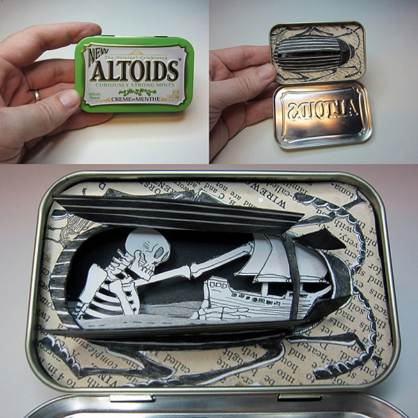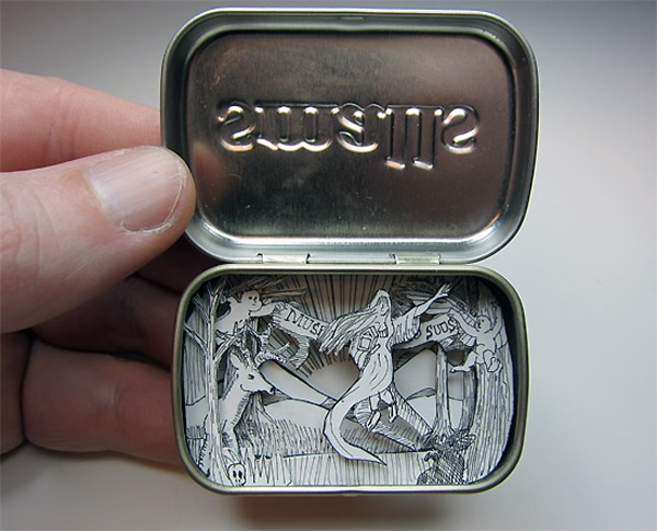 Jim Doran has it all figured out, and I’m absolutely blown away by what he does with his Altoid tins. Let me back up for just a moment and say that I’m used to seeing creative carvings. We’ve featured some crazy looking tire carvings, some Star Wars crayon carvings and even some unexpected phone book carvings, but Altoid tin carvings? I never thought I’d see that. Jim creates little dioramas out of Altoid tins and they are spectacular. He is a self-taught artist who not only makes these little scenes out of Altoid tins; he does it in all kinds of tiny little tins. You can learn more about him at Jim Doran. On his website he writes, “I put ideas inside of other objects.” I like it. I like it a lot.