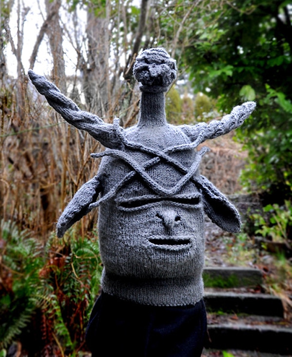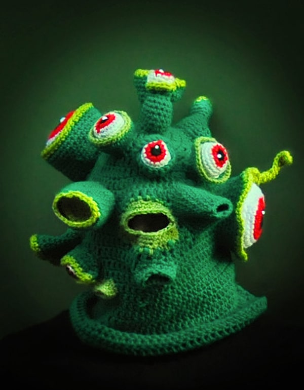 Many times when we see designs made to give you a chill like this, they are created with dreary boring colors. I really like how Tracy was able to incorporate all these beautiful colors while maintaining the creepiness of it all. Very nice! If you would like to see more of her collection or purchase one of these scary masks, you can click over to Brutal Knitting. After seeing these, I don’t think I’ll ever think of knitting the same again.