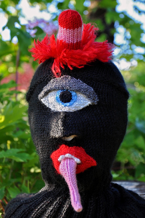 I don’t think I’ve ever seen the words brutal and knitting in the same sentence before. When I think of knitting, I think of sweet grandmas who carry around a little bag with different colors of yarn and knitting needles. I don’t usually think of scary masks that might give me nightmares.