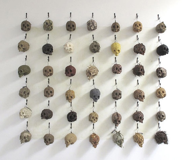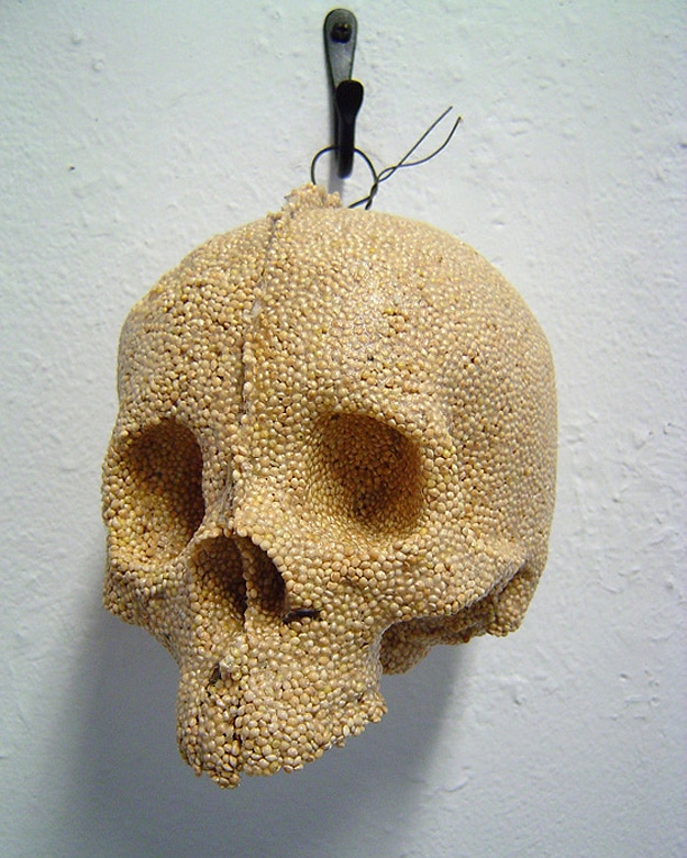 The artist, Helen Altman, molded these small skulls from natural materials like spices and seeds. She used glue to keep the shape together properly. When they dried, they looked like what you see here. There are a total of 42 skulls in the skull spice rack below, and each one is made from a different spice. A few of the spices she used are mustard seed, millet, lemon grass and black sesame seeds.