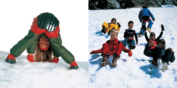 With the “Butt-Sled” you steer by shifting your weight. A foam-padded PVC seat is fused to the snowsuit shorts and is flexible to -20º F.