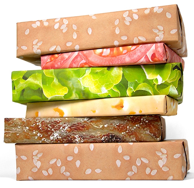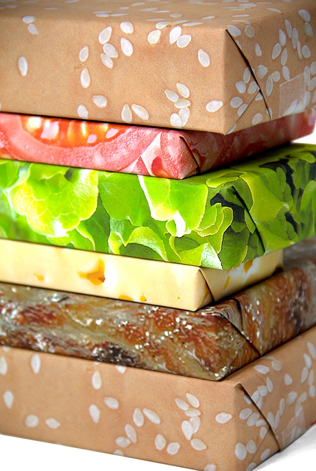 The set comes with five different designs. There is a sesame seed bun, a burger, a slice of cheese, some lettuce and tomato. The part that’s the most fun is that if you were to use this, you’d have to give the person 6 gifts that were relatively the same size so they could be stacked properly to assemble the cheeseburger. I love that! For the next 23 days, you can get an entire set of this wrapping paper for only 20 bucks here on Kickstarter. (Designers: Sarah Fay and Justin Colt)