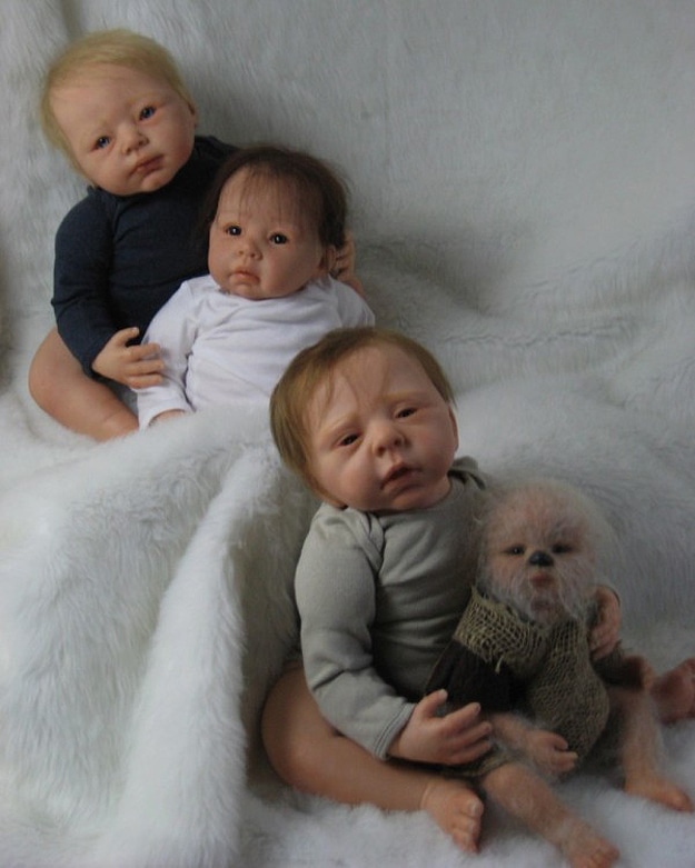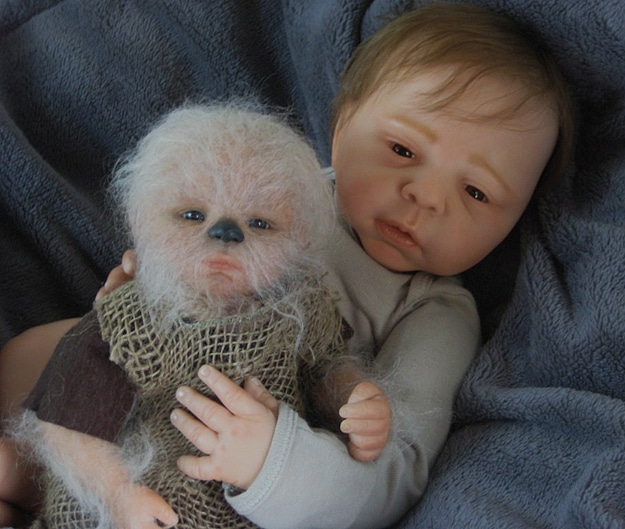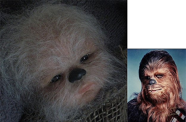 Chewie comes with a receiving blanket, a birth certificate and care instructions. He is also signed by the artist. He was born October 2, 2011, he weighs a little over 1 pound, and he is 13.5 inches long. Wait, it gets even better. Heike Kolpin also created a baby Han Solo, Princess Leia and Luke Skywalker reborn baby dolls. There is a picture of the entire set of four below. That is the Han Solo baby holding Chewie in the 3rd photo down. All I can really say is, wow. He’s got a face only a mother could love.