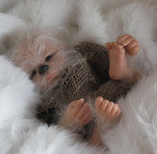 When I wrote about these crazy looking Harry Potter dolls, I really thought it wouldn’t get scarier than that, but I was definitely wrong. Do you crave an even bigger nightmare? Well then check out this Wookie/Chewbacca inspired reborn baby. It’s selling right now on eBay. At the time I’m writing this, the auction ends in 9 hours, and the current bid is 200 bucks. Yep, you read that right, 200 big ones for this.