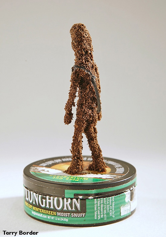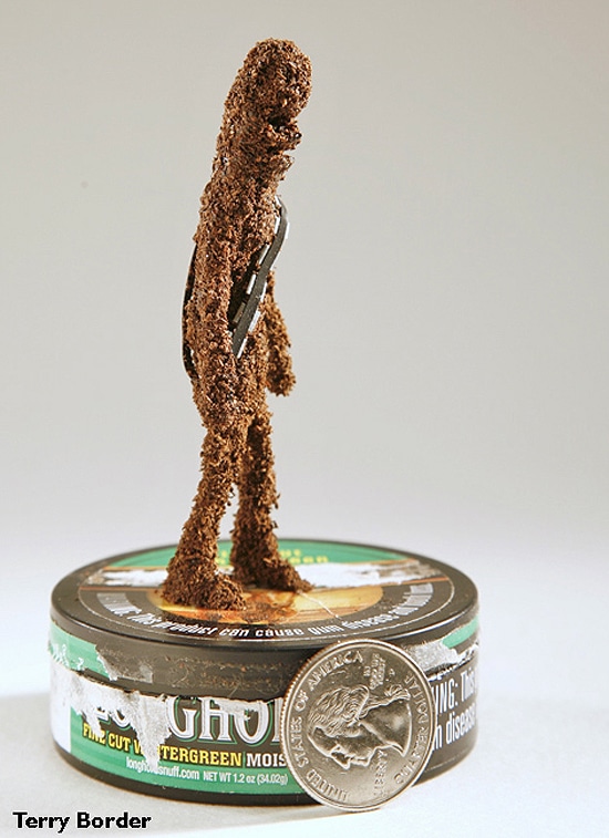 Terry says he went out one morning, purchased the cheapest snuff he could find, and 8 hours later Chewbacco was born. He is a little more than 4 inches tall, and he no longer smells like wintergreen flavored tobacco. I think this is the best use of chewing tobacco I’ve ever seen. I wish there was a tobacco Han Solo to go with him. Terry is even selling this cutie on eBay. He says that bids under one million dollars are somewhat insulting, but still welcomed. :)