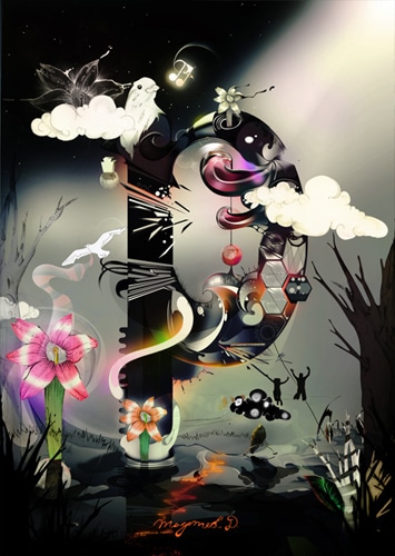 A lover of all that is illustration and typography, Mogomed is self taught. His artwork is captivating. In my own interpretation, it seems to combine a rough, graffiti dangerous style with a flowing, peaceful, calm beauty.