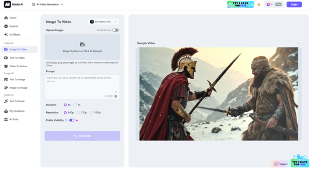 Visit Media.io directly in your web browser without downloading any software. Navigate to the AI Video Generator section from the homepage. Choose the feature that matches your project needs—options include “Text to Video” for script-based creation or “Image to Video” for transforming still images into motion.