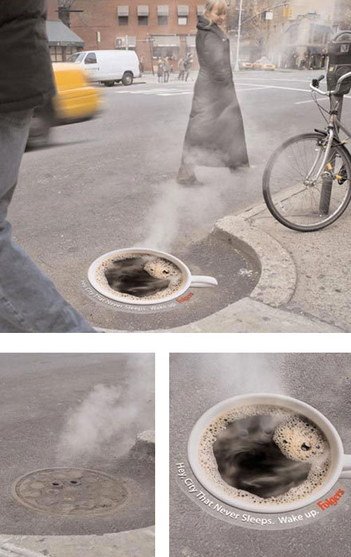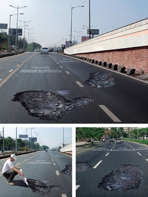 Below is a twist on this pothole photography; these two companies have chosen to advertise using the same general concept. The Folgers ad is on top of a manhole cover, and the Pioneer Suspension ad is a series of pothole stickers, which by the way, have made motorists slow down on that road (nice side effect).