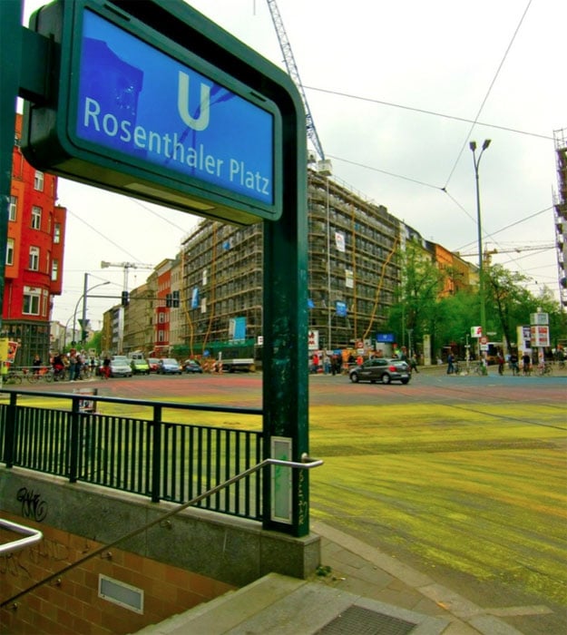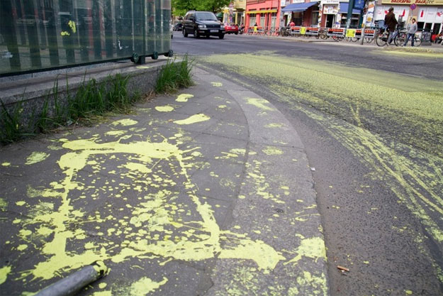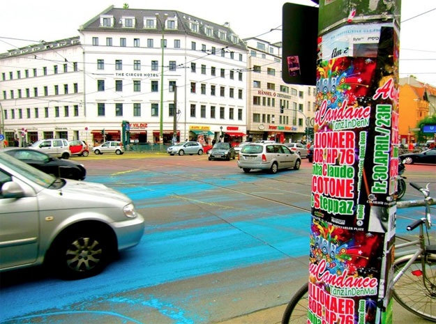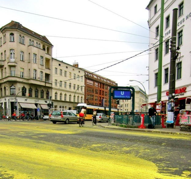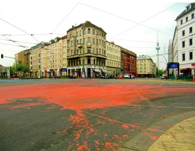 I bet you’ve never seen graffiti like this before. Two weeks ago a group of cyclists poured 13 gallons of bright beautiful paint on a street at an intersection at Rosenthaler Platz in Berlin. The cars waiting at the red light watched it happen, and then the drove through the paint. Their tires became the paint brushes that created this beautiful street art.