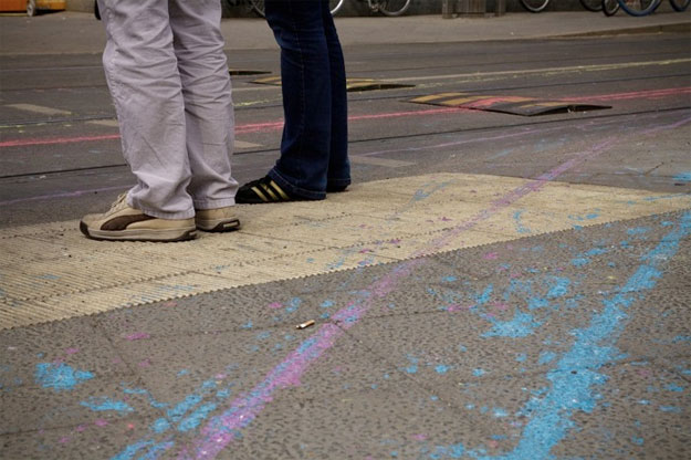 I know what you’re thinking, and no worries, they used paint that washes off with just water and they posted signs so people would understand this. The result was this beautiful piece of street graffiti in red, blue, yellow and purple. Daniel K, one of the organizers, wrote about the experience on a blog. You can check that out here.