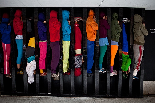 As you can see, the performers stood on top of each other and got in all kinds of unusual positions (even wrapping themselves around a fire hydrant) to achieve this colorful, artistic look. The purpose of this presentation was to explore the relationship between body, space and architecture.
